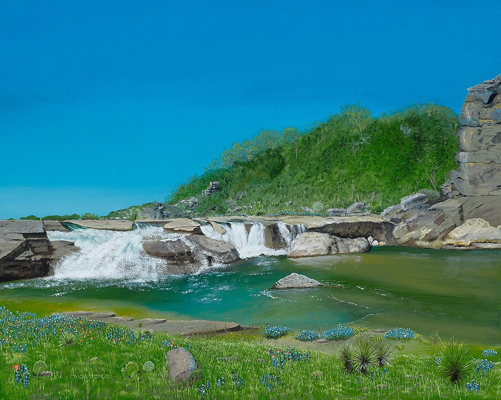 Oil on Canvas. The beauty of ancient limestone slabs and bluebonnets during a Texas spring come together at Pedernales Falls.